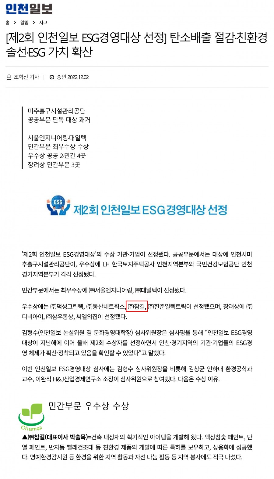 인천일보 제2회 ESG경영대상 민간부문 우수상 수상 페이지 정보 작성자 최고관리자 작성일22-12-07 15:08 조회28,765회 댓글0건 관련링크 본문 인천일보 제2회 ESG경영대상 민간부문 우수상 수상 댓글목록 등록된 댓글이 없습니다. 이전글 다음글 목록