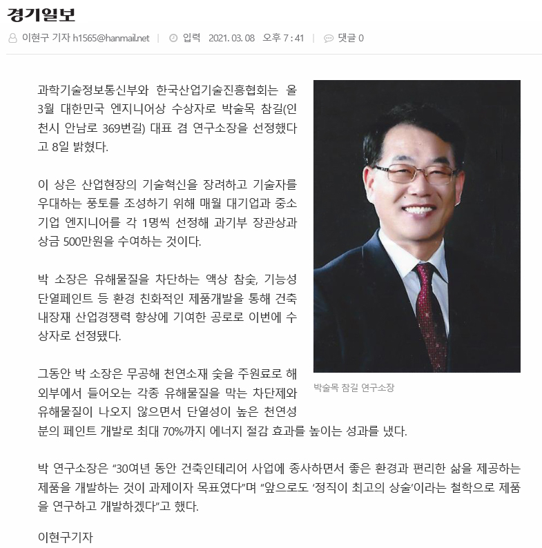 참길 박술목 대표 "대한민국 엔지니어상" 2021년3월 수상 선정 보도자료